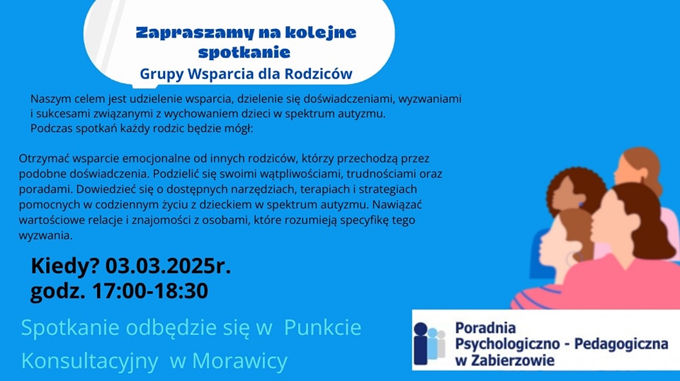 Serdecznie zapraszamy Państwa na kolejne spotkanie grupy wsparcia dla rodziców dzieci atypowych. Najbliższe spotkanie odbędzie się 3.03.2025r. w Punkcie Konsultacyjnym w Morawicy o godz. 17:00. Na spotkania zapraszamy rodziców z gmin Zabierzów, Liszki oraz Czernichów.