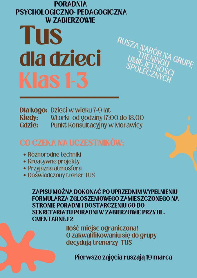 Informujemy, iż rusza nabór na zajęcia Treningu U,iejętności Społecznych dla dzieci z klas I-III, które odbywać się będą w Punkcie Konsultacyjmym w Morawicy we wtorki w godz. 17-18 (cykl 10 zajęć).