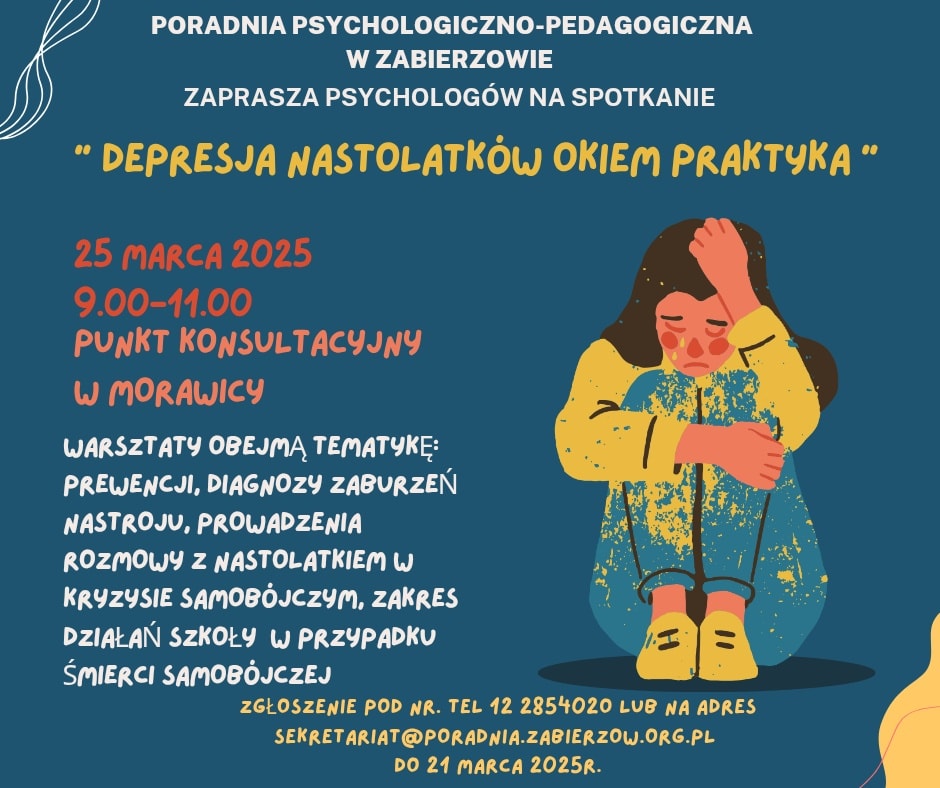 Już niebawem w Punkcie Konsultacyjnym w Morawicy w dniu 25 marca w godzinach od 9.00 do 11.00 odbęda się warsztaty metodyczne dla psychologów zatrudnionych w szkołach, poświęcone tematyce "Depresji wśród nastolatków -okiem praktyka". Podczas spotkania specjaliści z Poradni podzielą się z uczestnikami doświadczeniem w zakresie prowadzenia rozmowy z nastolatkiem w kryzysie samobójczym, prewencji czy też diagnozie zaburzeń nastroju. Każdy z uczestników oprócz certyfikatu otrzyma także przygotowany pakiet przydatnych materiałów oraz narzędzi.