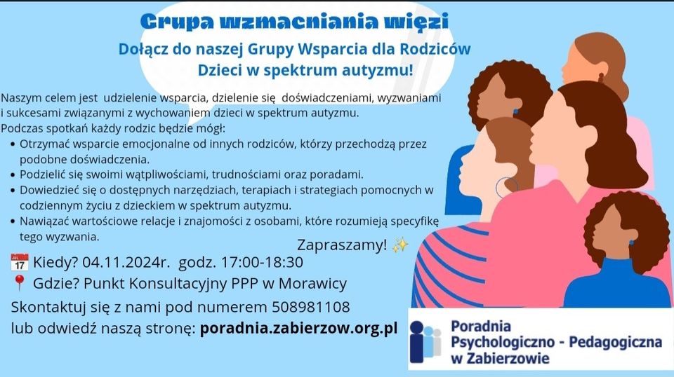 Drodzy Rodzice! Serdecznie zapraszamy na pierwsze spotkanie grupy wsparcia dla rodziców. Spotkania będą odbywały się w pierwsze poniedziałki każdego miesiąca. Szczegóły na plakacie Kinga Gibadło Dyrektor PPPwZ