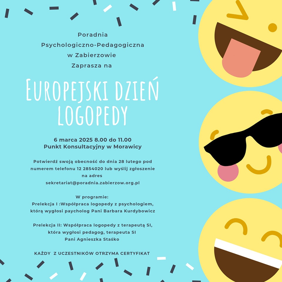 Serdecznie zapraszamy logopedów pracujących w przedszkolach i szkołach na terenie gmin: Zabierzów, Liszki, Czernichów na spotkanie z okazji Europejskiego Dnia Logopedy. Wydarzenie to odbędzie się 6 marca 2025 roku w godzinach od 8.00 do 11.00 w Punkcie Konsultacyjnym w Morawicy. Podczas spotkania będziecie Państwo mogli wysłuchać dwóch Prelekcja. Pierwsza z nich będzie dotyczyć współpracy logopedy z psychologiem, drugi natomiast współpracy logopedy z terapeutą SI.