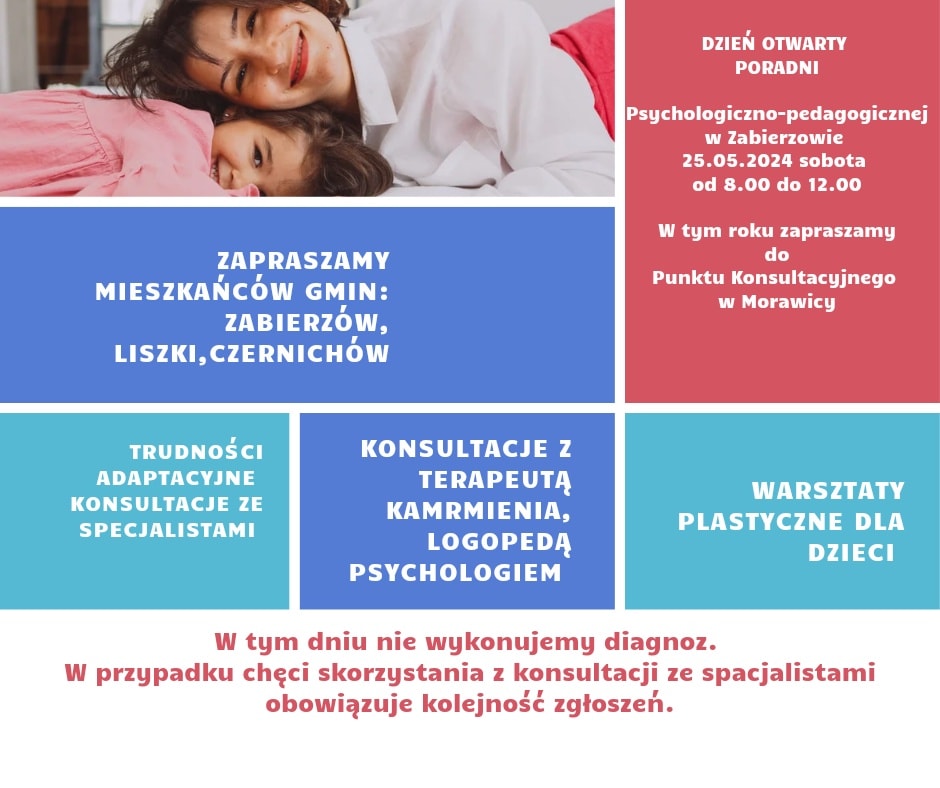 Serdecznie zapraszamy mieszkańców Gmin: Zabierzów, Liszki oraz Czernichów na Dzień Otwarty Poradni Psychologiczno-Pedagogicznej w Zabierzowie, który w tym roku odbędzie się 25 maja w Punkcie Konsultacyjnym w Morawicy. Podczas dnia otwartego do Państwa dyspozycji pozostają specjalisci PPPwZ. Dla młodszych dzieci zaplanowaliśmy warsztaty plastyczne. Podczas dnia otwartego istnieje możliwość konsultacji z psychologiem, neurologopedą a także terapeutą zaburzeń karmienia. Dla rodziców dzieci rozpoczynających przygodę z przedszkolem, lub dzieci prezentujących trudności adaptacyjne przewidziane są także konsultacje i warsztaty.
