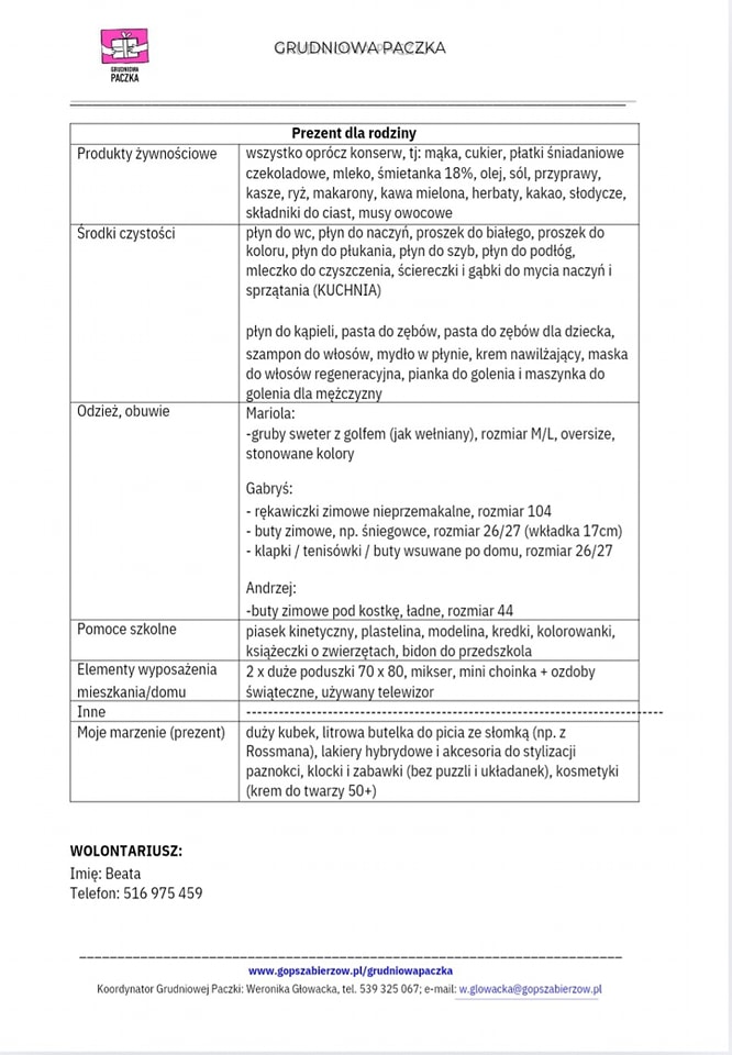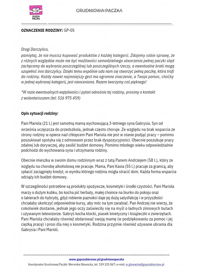 Kochani jak co roku staramy się w tym wyjątkowym świątecznym czasie wspierać tych, którzy tej pomocy potrzebują. Wzorem poprzednich lat Nasza Poradnia po raz kolejny przyłącza się do corocznej akcji organizowanej przez Gminny Ośrodek Pomocy Społecznej w Zabierzowie. W tym roku chcemy wesprzeć kolejną z rodzin. Jeżeli ktokolwiek z Państwa będzie miał życzenie, ochotę wesprzeć Nas w tej zbiórce, gorąco zachęcamy. Lista potrzebnych rzeczy znajduje się na zdjęciach w poście. Potrzebne rzeczy takie jak: żywność, środki czystości, najpotrzebniejszą odzież można dostarczać do Naszej Placówki w godzinach pracy do dnia 20 grudnia. Być może ktoś z Waszych znajomych ma na zbyciu sprawny telewizor i zechciałby go przekazać tej rodzinie?